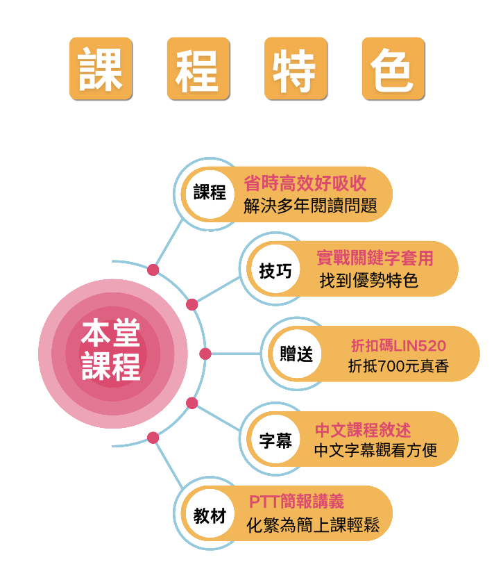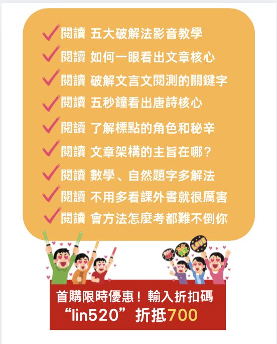 這門課程主要是針對「對於閱讀沒耐心」「討厭看很多字」「不想每次都錯很多課外題」的國高中學生、高普考考生所設計。