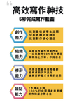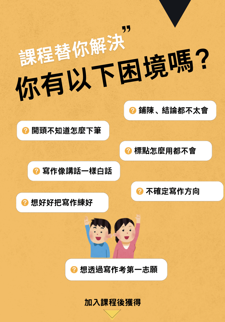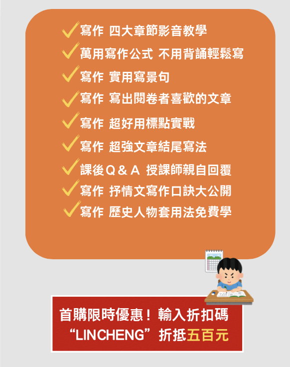想學會:開頭怎麼下筆想學會:結尾怎麼收筆想學會:使用精美的修辭美化文章想學會:特殊標點幫文章提示重點想學會:打造「一則萬用故事」套用所有文章想學會:記敘文、抒情文、論說文、說明文分類與書寫想學會:寫景句子如何使用想學會:情感句子如何使用